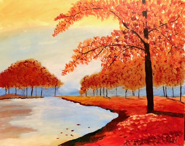 “Crimson Path” This painting captures the stillness of a quiet lake framed by trees in full autumn blaze. The curved shoreline pulls the eye forward, inviting the viewer to follow the trail through layers of red, gold, and reflection.