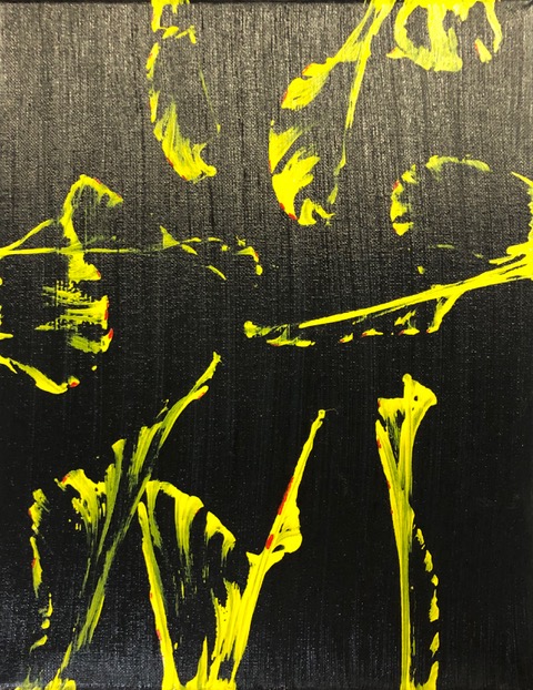 “The Tension Line” This piece was created with rope, pressure, and preconception. Each line of paint wasn’t brushed, but pressed and dragged, through deliberate placement of rope across a black canvas. The outcome: bold yellow forms that dance between structure and abstraction, like light breaking through shadow.