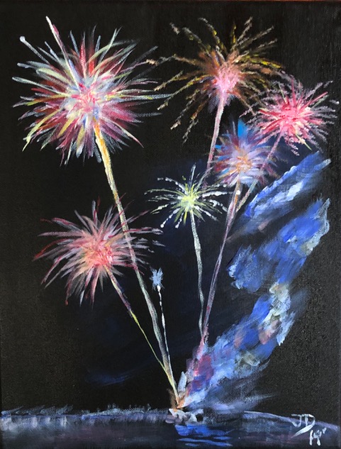 “Let It Rise” Firework explode against a midnight sky, trailing light and color as they reflect across the water’s surface. The brushwork is loose, vibrant, and alive, capturing not just the moment, but the feeling of something breaking free.
