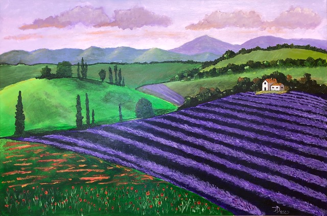 “Lavender Hills” A peaceful hillside meets the bold rhythm of lavender rows—framed by distant mountains and a sky touched with evening light. Inspired by the colors of Europe’s countryside, this painting captures the kind of place we all want to escape to: quiet, grounded, and just out of reach.
