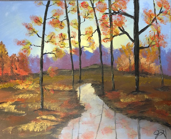 “Whispers of Fall” Golden leaves shimmer on tall, reaching trees as a winding stream reflects the soft sky above. The quiet path between seasons invites you to pause, to notice the in-between moments that often pass us by.