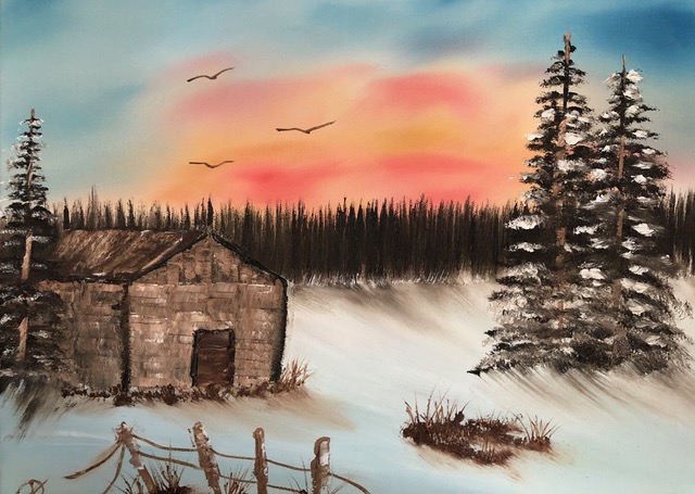 “Winter Refuge” A quiet cabin stands against the cold, its weathered walls framed by snow-dusted pines and a soft sunset sky. The stillness is only broken by the silhouettes of birds gliding overhead, and the suggestion that someone once called this frozen clearing home.