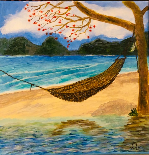“Island Stillness” A worn hammock swings gently between two trees, untouched by time, as warm water laps against the shore. In the distance, deep green islands rise through misty skies, framing a moment of perfect peace.